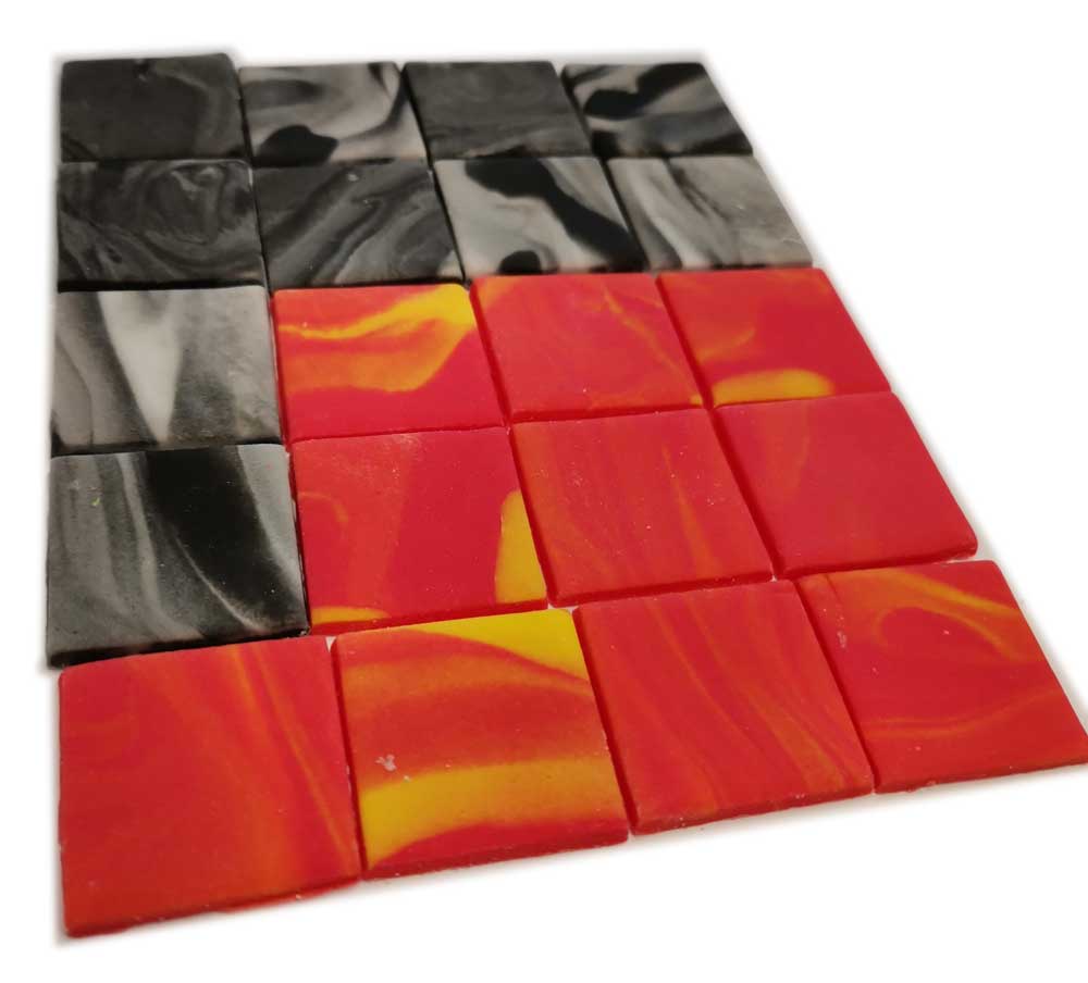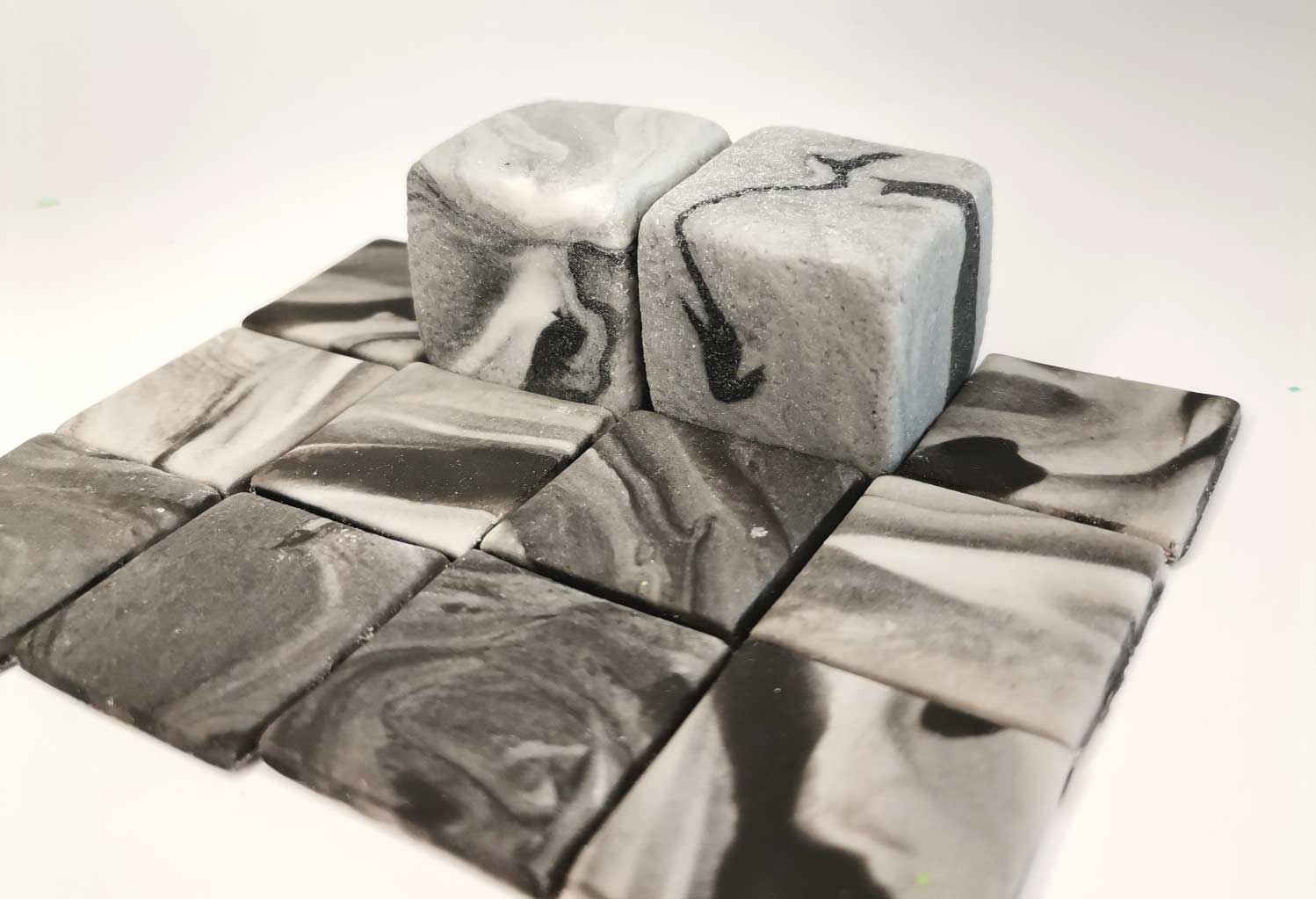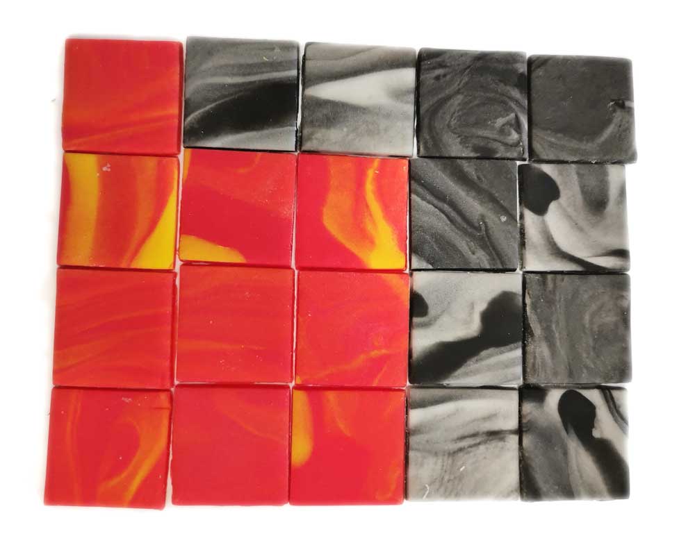 Zestaw zawiera 20 kafelków w stylu lawa (10) i kamień (10) o wymiarze ok. 2,5cm