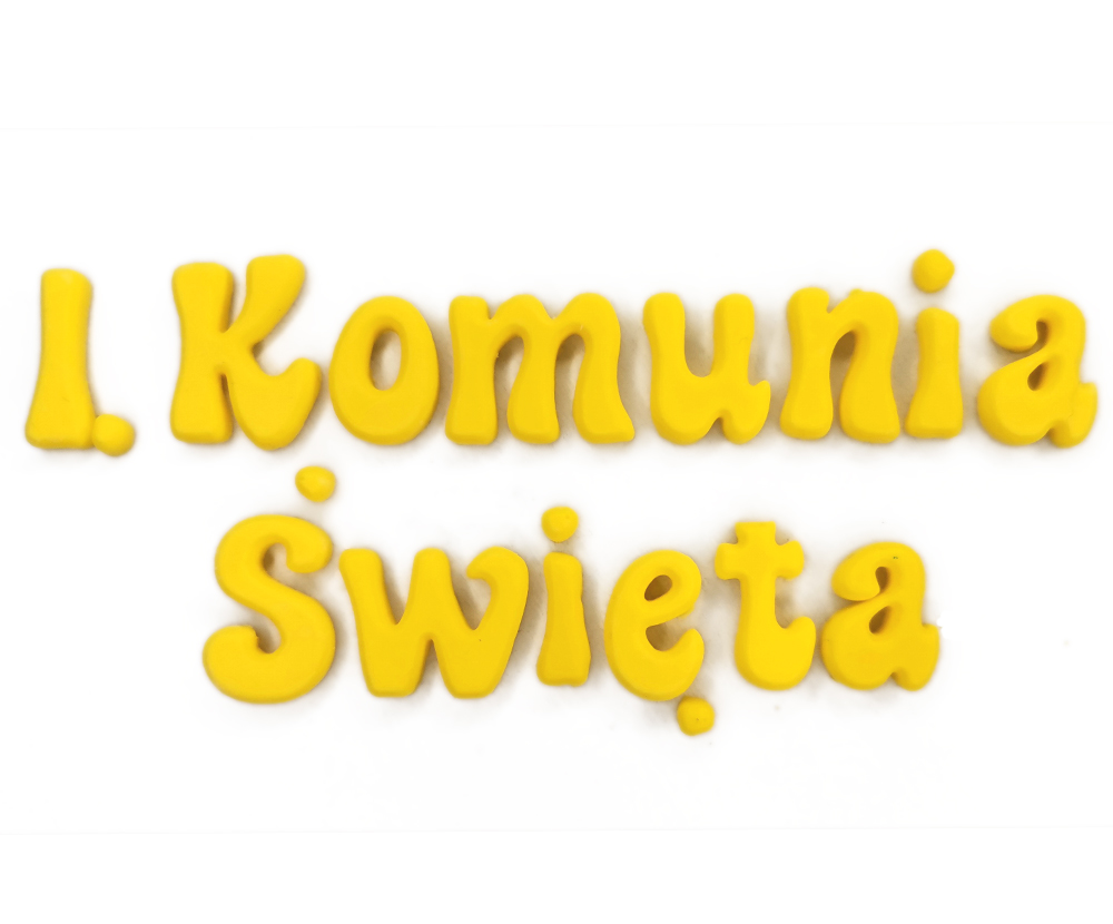 Cukrowe napisy są idealnym uzupełnieniem każdego słodkiego wypieku. W tej ofercie możesz zamówić napis I. Komunia Święta w kolorze żółtym.